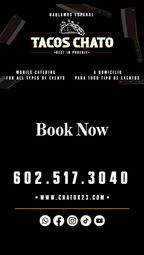 Looking for someone to provide you with the food at your next event? Large or small, we do it all! Get in touch to start planning the perfect meal for a business lunch, wedding, cocktail reception, and more! Call Tacos Chato and ask for me Saul or Yessy @ 602-517-3040